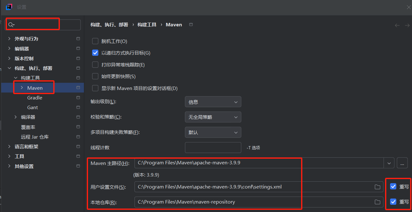 打开idea,在新建项目设置--为新项目设置,左上角搜索maven,设置maven主路径,用户设置文件,本地仓库。设置用户设置文件和本地仓库时先勾选重写。