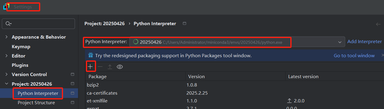 5.在项目要下载第三方库时,在终端pip install默认下载到python版本,在引入第三方库失败。要下载到项目的conda环境要在setting--python interpreter,由于在创建是选择的环境是conda,所以这里的python interpreter路径是conda环境独立的解释器,点击+号搜索下载,第三方库下载到conda环境,下载后引入第三方库成功。