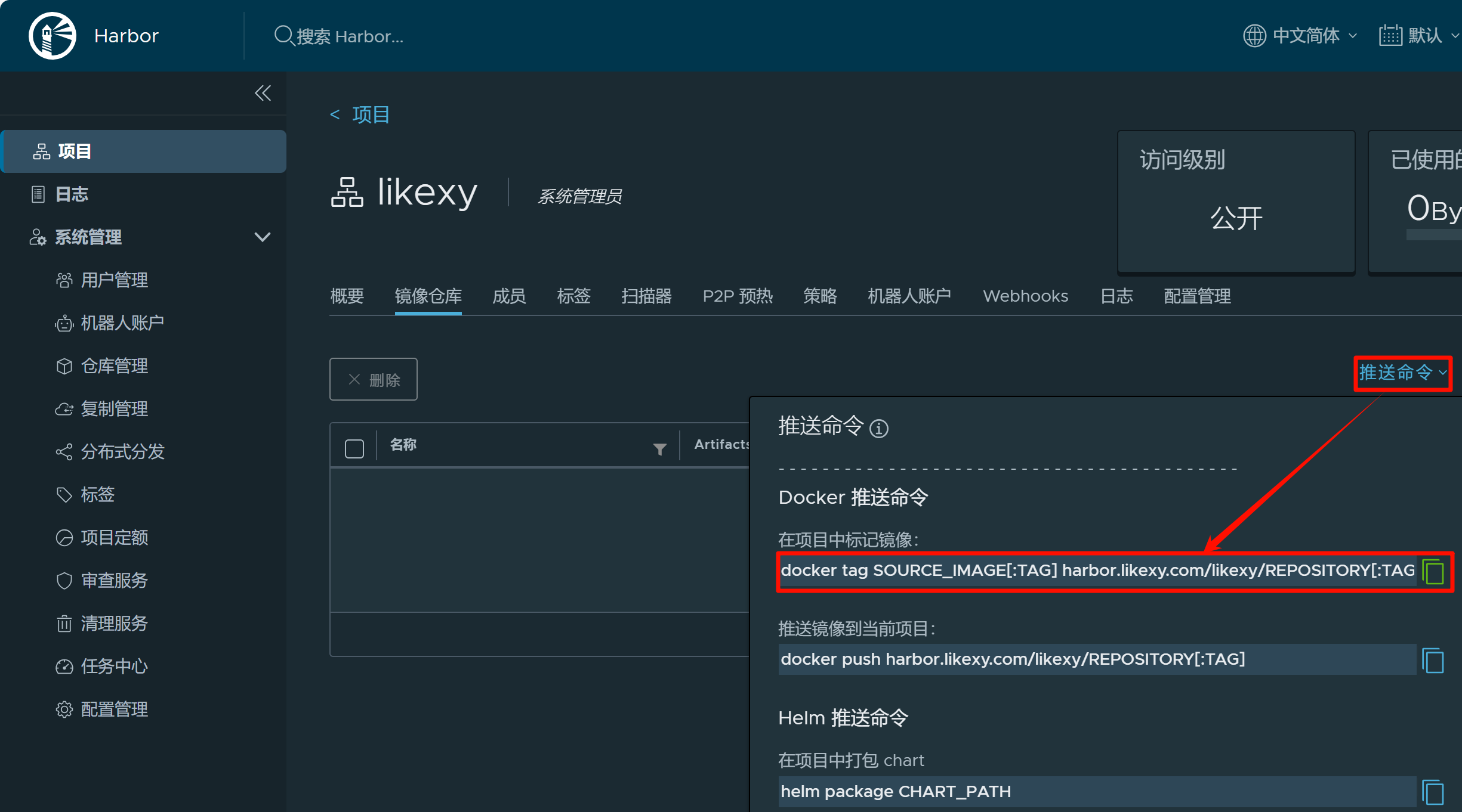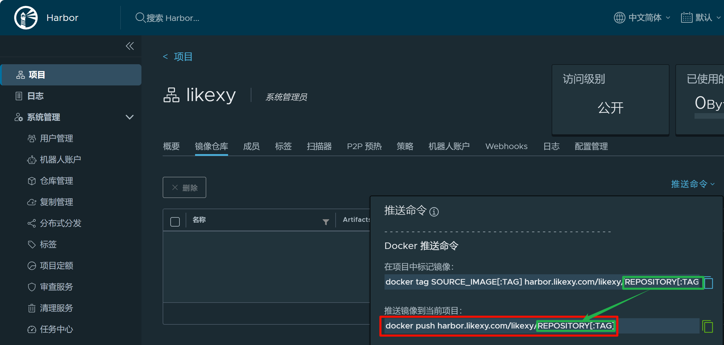 图9 复制推送镜像命令,标记和推送的REPOSITORY[:TAG]要一致