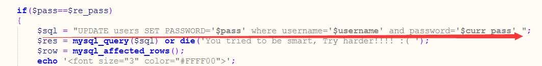 登录之后修改密码,由于没有将用户名中危险字符过滤,将用户名拼接到这行代码之中