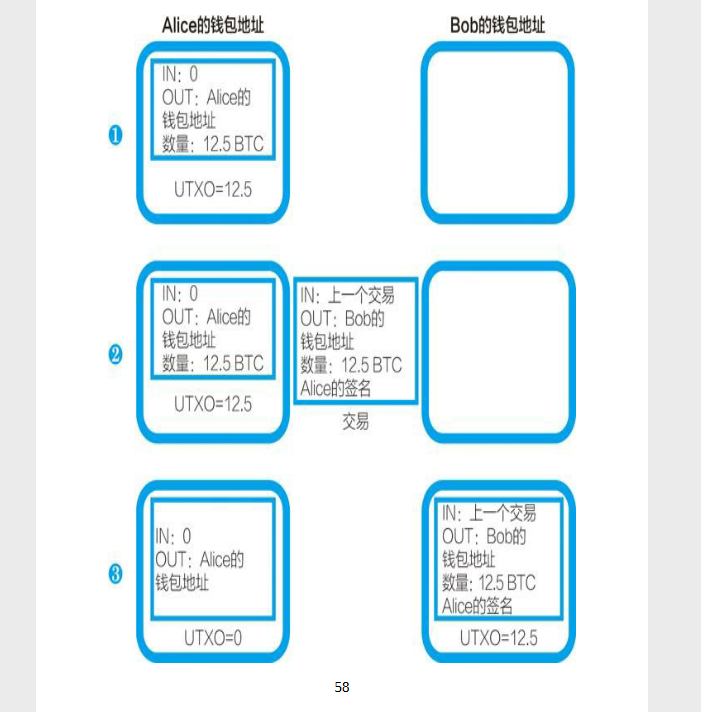(3)当交易被确认后,Alice的UTXO就变成了0,而Bob的钱包地 址中就多了一个UTXO,数量是12.5。 存在Bob的钱包地址中的这些比特币,只有用Bob的私钥签名才可 以动用。Bob要将这些比特币转账给其他人,则重复上述过程。