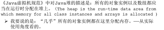 明确一点:目前Oracle Hotspot JVM没有将那些不逃逸的对象分配在栈上,所以认为所有的对象实例都是创建在堆上。