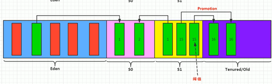 如果对象在Eden区出生,并经过第一次Minor GC后仍然存活,并且能被Survivor容纳的话,将被移动到Survivor空间中,并将对象年龄设为1。对象在Survivor区中每经历过一次Minor GC后,年龄就增加1岁,当它的年龄增加到一定程度(默认15岁),就会被晋升到老年代。