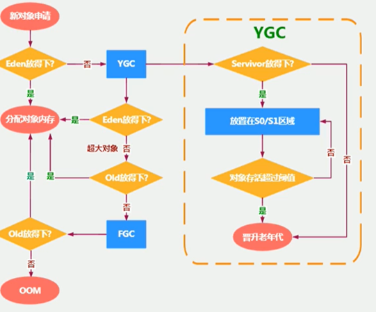 ②放不下:则进行FGC,如果完了之后,老年代能放下了,则分配空间,否则OOM。