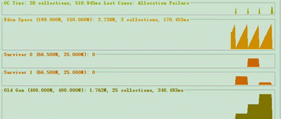 可以看到,Eden区的大小逐步增长,在到达峰值时,进行YGC,然后先是S1区装入了幸存的数据。然后第二次峰值YGC时,幸存的数据被装入S0中。