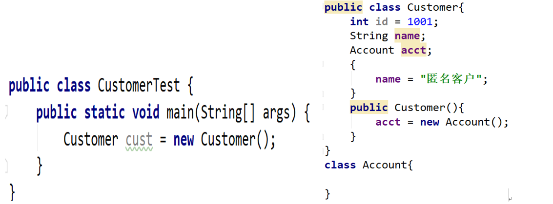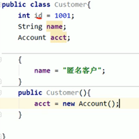 例如:id是显式初始化,name是代码块初始化,acct是构造器中初始化