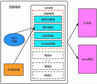 (3) 当然方法在执行的过程中,执行引擎有可能会通过存储在局部变量表中的对象引用准确定位到存储在java堆区中的对象实例信息,以及通过对象头中的元数据指针定位到目标对象的类型信息。