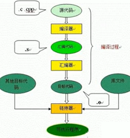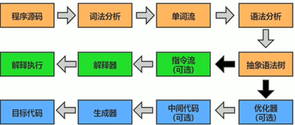 编译过程:读取源程序(字符流),对之进行词法和语法的分析,将高级语言指令转换为功能等效的汇编代码。