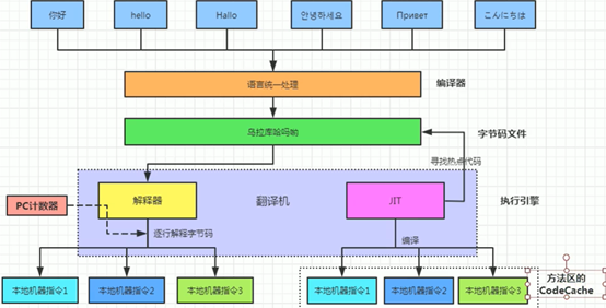 如果想要让一个Java程序运行起来,执行引擎(Execution Engine)的任务就是将字节码指令解释/编译(后端编译)为对应平台上的本地机器指令才可以。简单来说,JVM中的执行引擎充当了将高级语言翻译为机器语言的译者。