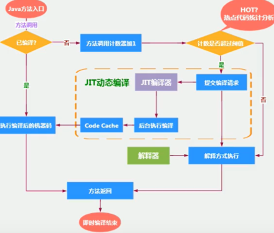 为了解决该问题,JVM平台支持一种叫做即时编译的技术。即时编译的目的是避免函数被解释执行,而是将整个函数体编译为机器码,每次函数执行时,只执行编译后的机器码即可。