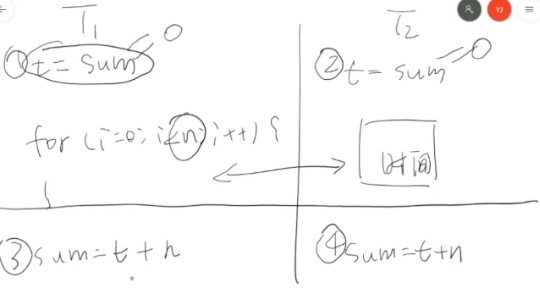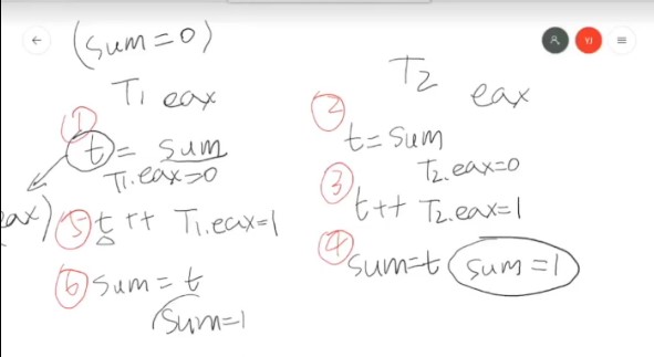 两个线程同时执行sum++,六条指令的执行顺序:①->②->③->④->⑤->⑥