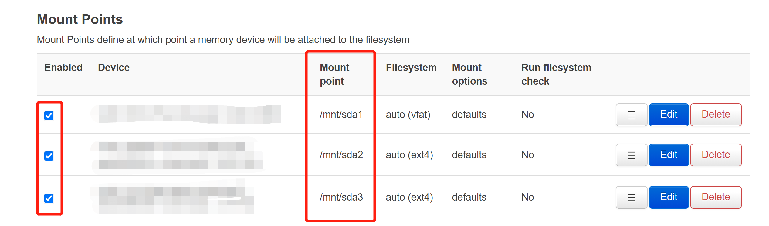 在openwrt的web管理界面, 挂载sda2分区, 用途为"overlay使用", 并启用。