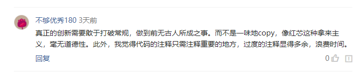 4.真正的创新需要敢于打破常规,做到前无古人所成之事。而不是一味地copy,像红芯这种拿来主义,毫无道德性。此外,我觉得代码的注释只需注释重要的地方,过度的注释显得多余,浪费时间。