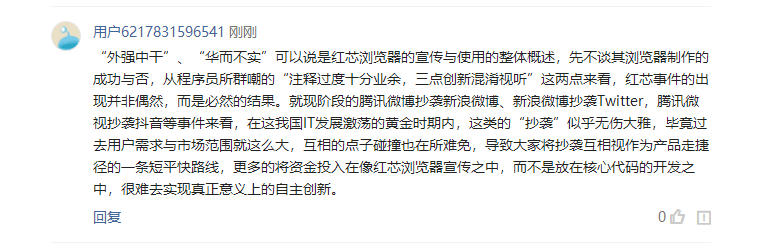 “外强中干”、“华而不实”可以说是红芯浏览器的宣传与使用的整体概述,先不谈其浏览器制作的成功与否,从程序员所群嘲的“注释过度十分业余,三点创新混淆视听”这两点来看,红芯事件的出现并非偶然,而是必然的结果。就现阶段的腾讯微博抄袭新浪微博、新浪微博抄袭Twitter,腾讯微视抄袭抖音等事件来看,在这我国IT发展激荡的黄金时期内,这类的“抄袭”似乎无伤大雅,毕竟过去用户需求与市场范围就这么大,互相的点子碰撞也在所难免,导致大家将抄袭互相视作为产品走捷径的一条短平快路线,更多的将资金投入在像红芯浏览器宣传之中,而不是放在核心代码的开发之中,很难去实现真正意义上的自主创新。