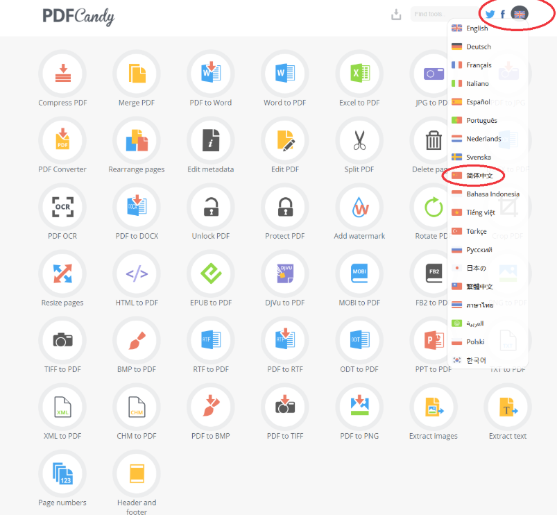 1、 PDF Candy: https://pdfcandy.com/ 点击右上角 可以选择简体