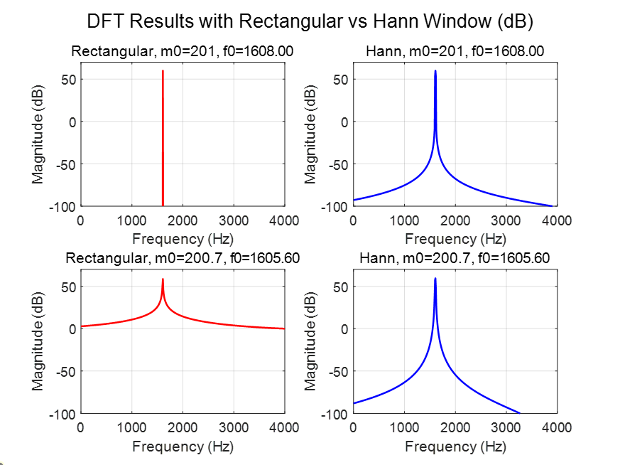 - 当 $m_0$ 为整数(如 201)时:矩形窗下无泄漏,能量完全集中在单个 bin;