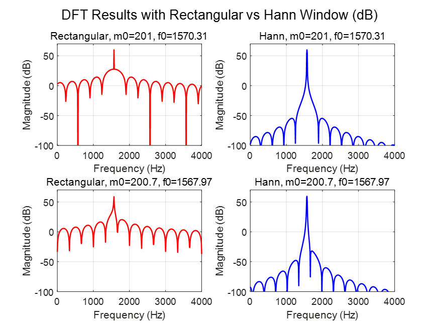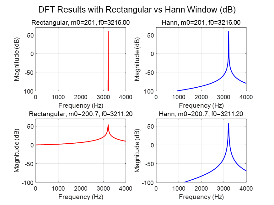 clear; fs = 8000; % Sampling frequency (Hz) t = (0:1000-1)'; % Time sequence (0~999) L = length(t); % ---------- nfft ---------- nfft = L; % Default setting, can change later % ----------------------------------- f = (0:nfft-1)' * (fs/nfft); % Frequency axis m0_list = [201, 200.7]; % Two test frequencies f0_list = m0_list * fs / nfft; % Hann window (with normalization for amplitude correction) w = hann(L); w = w / mean(w); figure; for idx = 1:2 m0 = m0_list(idx); f0 = f0_list(idx); % ----------- Case 1: Rectangular window (no window) ----------- x_rect = exp(1i*2*pi*m0/nfft * t); % DFT by definition X_rect = zeros(nfft,1); for k = 1:nfft for n = 0:L-1 X_rect(k) = X_rect(k) + x_rect(n+1) * exp(-1i*2*pi*(k-1)/nfft * n); end end % ----------- Case 2: Hann window ----------- x_hann = x_rect .* w; X_hann = zeros(nfft,1); for k = 1:nfft for n = 0:L-1 X_hann(k) = X_hann(k) + x_hann(n+1) * exp(-1i*2*pi*(k-1)/nfft * n); end end % ----------- Plot results ----------- subplot(2,2,(idx-1)*2+1); plot(f, 20*log10(abs(X_rect)), 'r','LineWidth',1.2); grid on; xlabel('Frequency (Hz)'); ylabel('Magnitude (dB)'); title(['Rectangular, m0=', num2str(m0), ', f0=', num2str(f0,'%.2f')]); xlim([0, fs/2]); ylim([-100,70]); subplot(2,2,(idx-1)*2+2); plot(f, 20*log10(abs(X_hann)), 'b','LineWidth',1.2); grid on; xlabel('Frequency (Hz)'); ylabel('Magnitude (dB)'); title(['Hann, m0=', num2str(m0), ', f0=', num2str(f0,'%.2f')]); xlim([0, fs/2]); ylim([-100,70]); end sgtitle('DFT Results with Rectangular vs Hann Window (dB)');