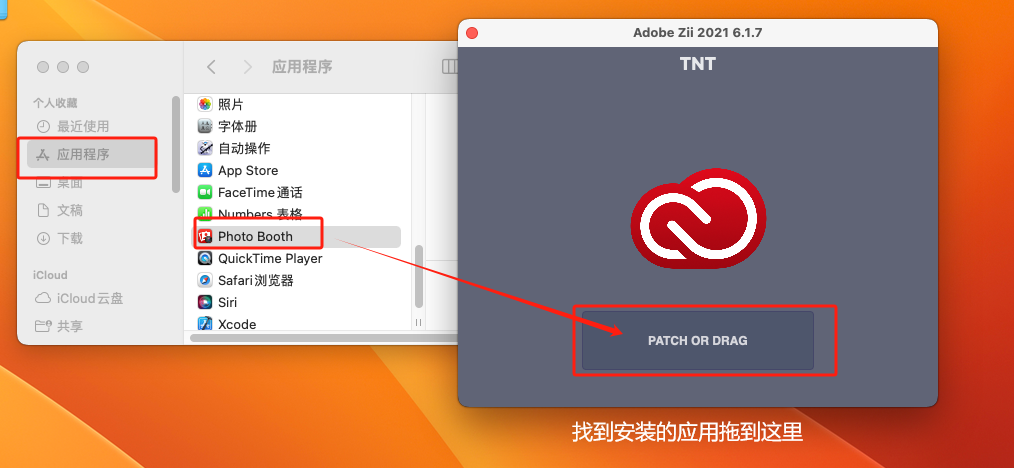 找到安装的程序,拖拽到 PATCH OR DRAG