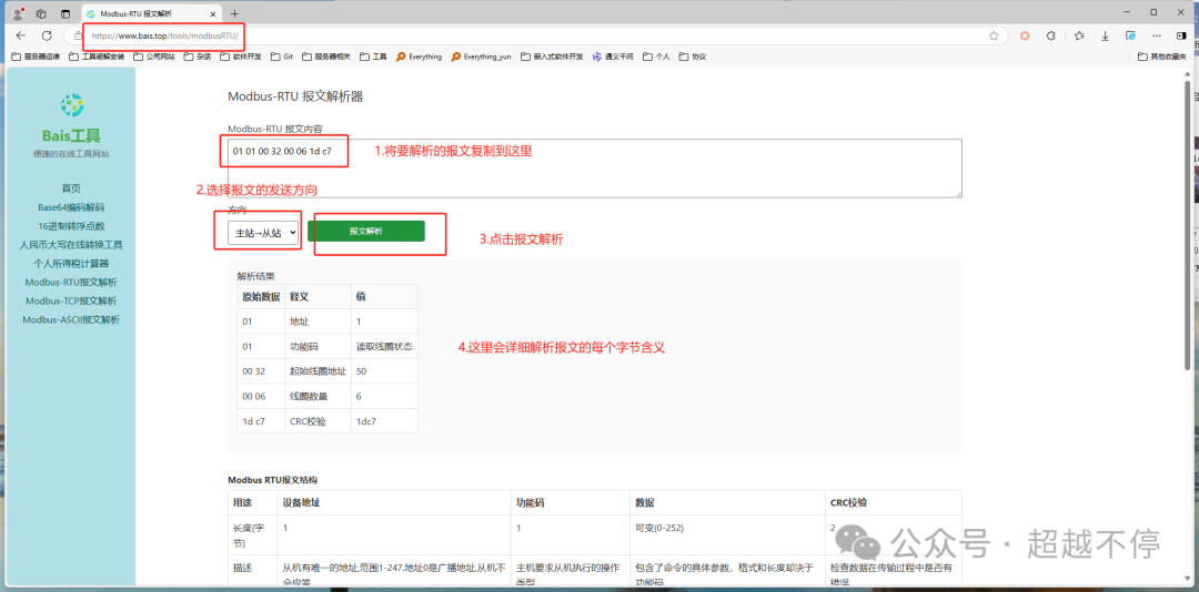 若要详细分析报文释义,可以复制报文数据,然后打开网页:在线报文解析(https://www.bais.top/tools/modbusRTU/)