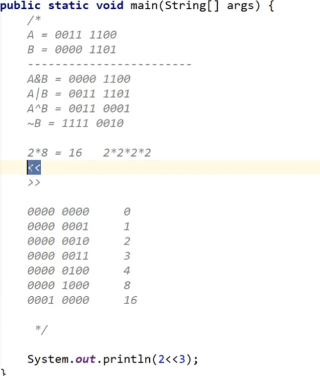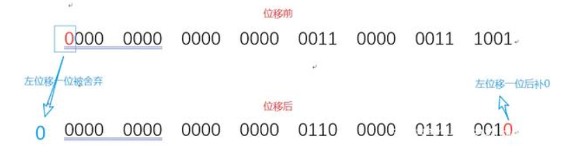 思考一下:如果任意一个十进制的数左位移32位,右边补位32个0,十进制岂不是都是0了?当然不是!!! 当int 类型的数据进行左移 的时候,当左移的位数大于等于32位的时候,位数会先求余数,然后再进行左移,也就是说,如果真的左移32位 12345 << 32 的时 候,会先进行位数求余数,即为 12345<<(32%32) 相当于 12345<< 0 ,所以12345<< 33 的值和12345<<1 是一样的,都是 24690。