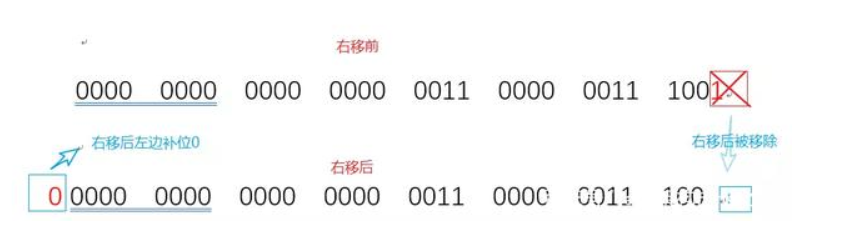 右移后得到的值为 6172 和int 类型的数据12345除以2取整所得的值一样,所以有些时候也会被用来替代除2操作。另外,对于超过32位的位移,和左移运算符一样,,会先进行位数求余数。