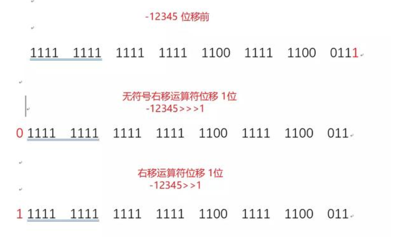 无符号右移运算符和右移运算符是一样的,不过无符号右移运算符在右移的时候是补0的,而右移运算符是补符号位的。以下是-12345二进制表示: