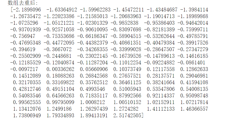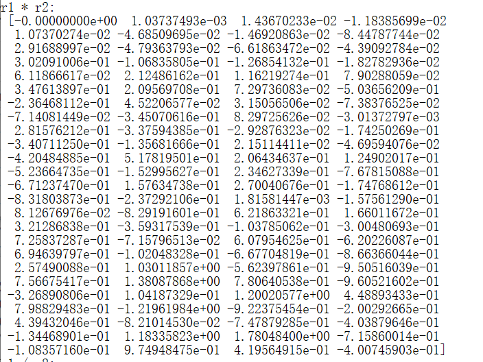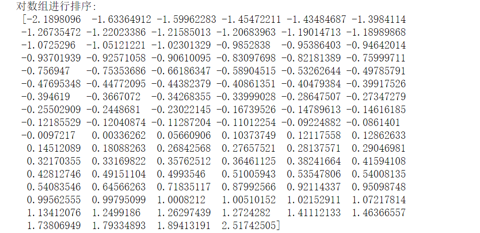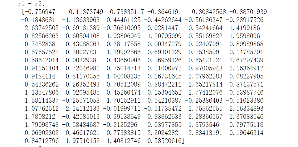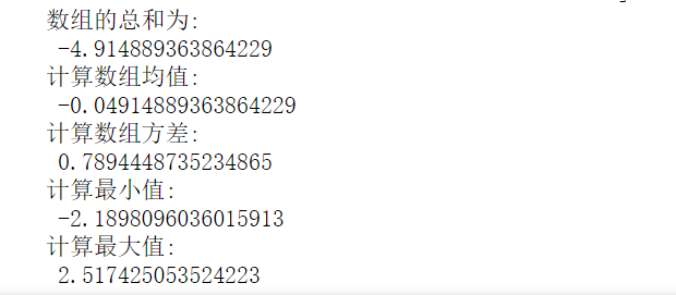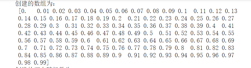 import numpy as np #创建一个数值范围为0-1,间隔为0.01的数组 r1=np.arange(0,1,0.01) print('创建的数组为:\n',r1) #创建100个服从正态分布的随机数 r2=np.random.randn(100) print('创建的正态随机数为:\n',r2) #对创建的两个数组进行四则运算 print('r1 + r2:\n',r1+r2) print('r1 - r2:\n',r1-r2) print('r1 * r2:\n',r1*r2) print('r1 / r2:\n',r1/r2) #对创建的随机数组进行简单的统计分析 #print('数组的长度为:\n',np.loadtxt(r2)) print('数组去重后:\n',np.unique(r2)) print('对数组进行排序:\n',np.sort(r2)) print('数组的总和为:\n',np.sum(r2)) print('计算数组均值:\n',np.mean(r2)) print('计算数组方差:\n',np.var(r2)) print('计算最小值:\n',np.min(r2)) print('计算最大值:\n',np.max(r2))