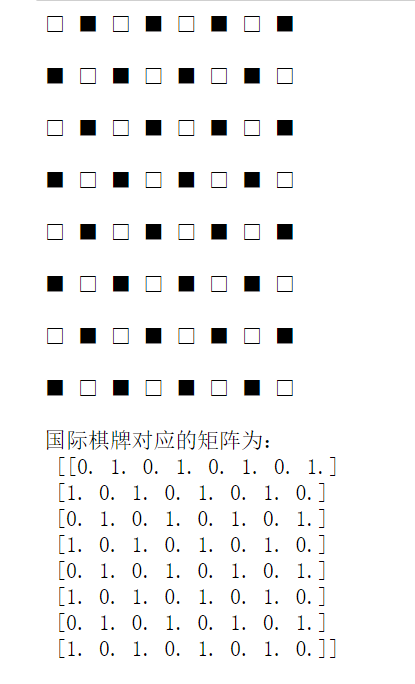 import numpy as np for i in range(0,8): for j in range(0,8): if mp[i,j]==0: print('□',end=' ') else: print('■',end=' ') print('\n') mp=np.ones((8,8)) for i in range(8): for j in range(8): if (i+j)%2==0: mp[i,j]=0 print('国际棋牌对应的矩阵为:\n',mp)