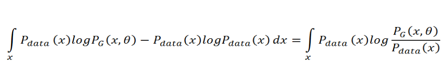 在上面的推导中,我们希望最大化似然函数 L。若对似然函数取对数,那么累乘 ∏ 就能转化为累加 ∑,并且这一过程并不会改变最优化的结果。因此我们可以将极大似然估计化为求令 log[P_G(x;θ)] 期望最大化的θ,而期望 E[logP_G(x;θ)] 可以展开为在 x 上的积分形式:∫P_data(x)logP_G(x;θ)dx。又因为该最优化过程是针对θ的,所以我们添加一项不含θ的积分并不影响最优化效果,即可添加 -∫P_data(x)logP_data(x)dx。添加该积分后,我们可以合并这两个积分并构建类似 KL 散度的形式。该过程如下: