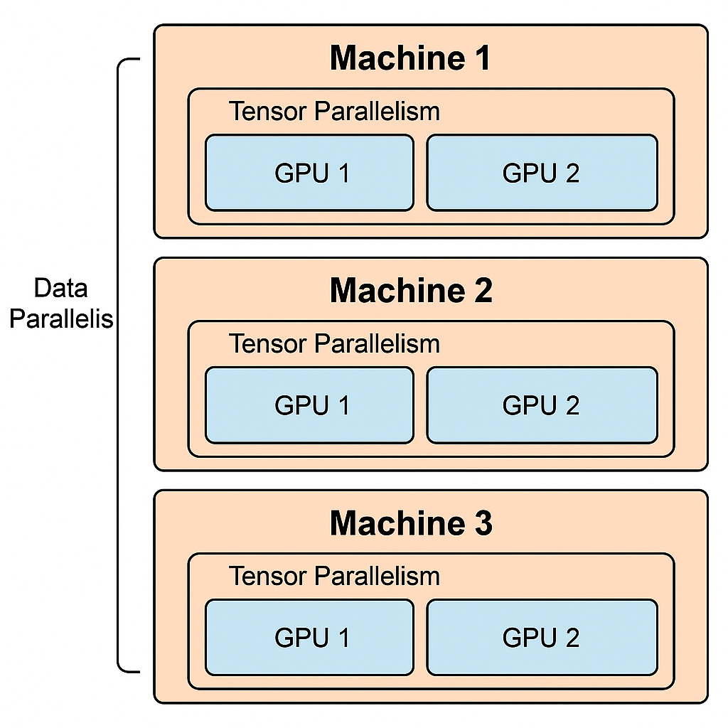 张量并行(Tensor Parallelism) 通常用于 同一机器的不同GPU之间,而 数据并行(Data Parallelism) 则用于 跨机器(甚至跨节点)之间的分布式训练。这两种并行方式的分工主要是基于通信成本和可扩展性的考量。