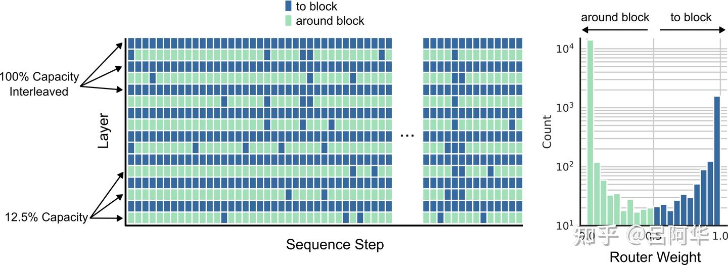 作为高层次的直觉提醒,每个token都经过一个路由器进行处理,产生一个标量权重,然后使用top-k权重来选择将通过transformer块的token标识,该块包括自注意力和随后的MLP。