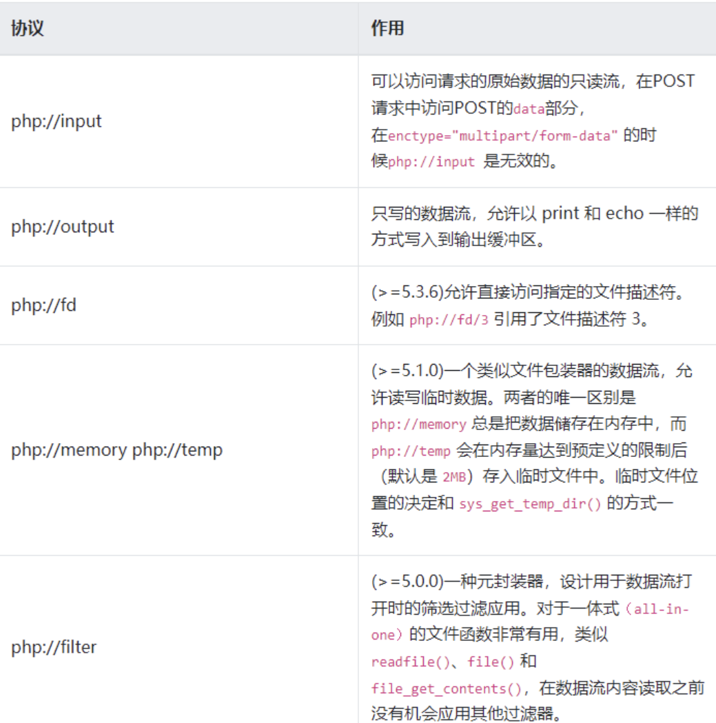 php:// 访问各个输入/输出流 (I/O streams), 在ctf中经常使用的是 php://filter 和 php://input