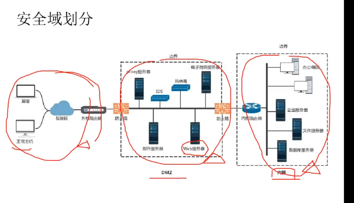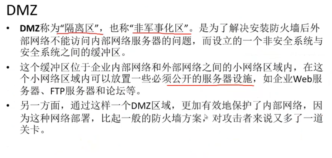 DMZ的作用就是缓冲的作用,外网无法直接访问内网,但是需要获取内网的资源,就通过外网访问DMZ,DMZ访问内网来获取,上图的网络安全等级可划分为三个层次,第一个层次是 外网,也是安全系数最低的,第二个层次就是DMZ区域,安全系数中等,第三个区域就是内网区域,安全系数最高。一般在DMZ区域定制访问策略。其实很多时候,我们通过网页打进内网,并不是实际意义上的内网,而是DMZ区域。