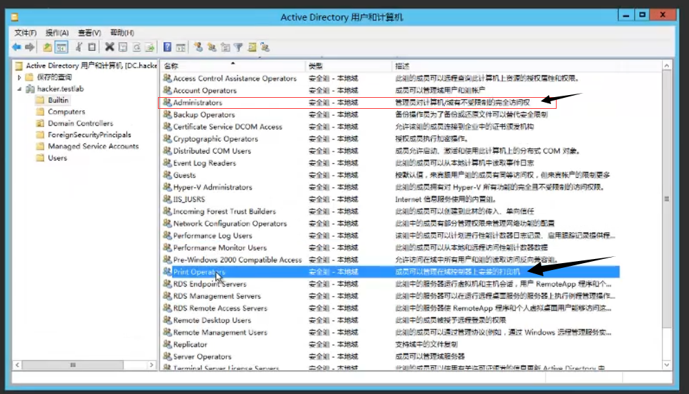 第一个就是管理员组,在活动目录中默认有管理员组,在域中是最强大的组。