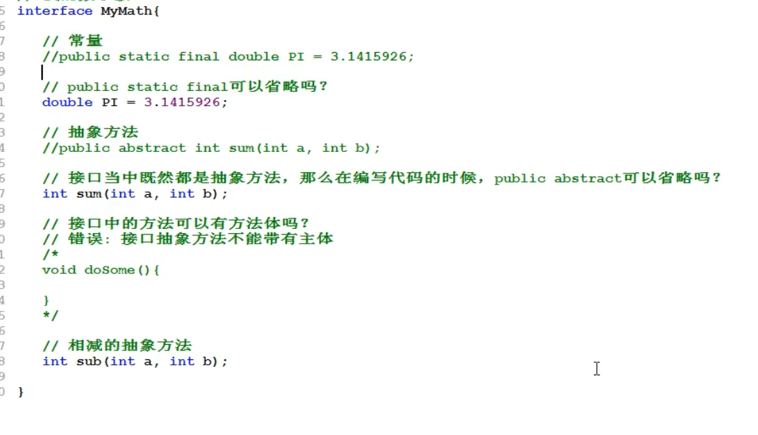 接口中的方法都是抽象方法,所以定义开头都是 public abstract int sum(int a ,int b ); 所以在接口中定义方法可以省略前面的 public abstract