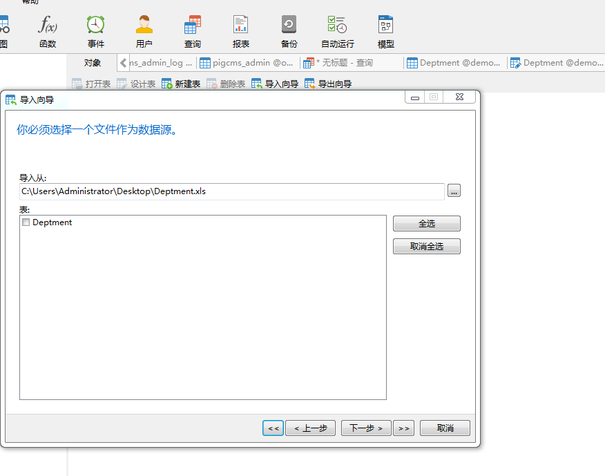 2)选择要导入的表,然后点击下一步