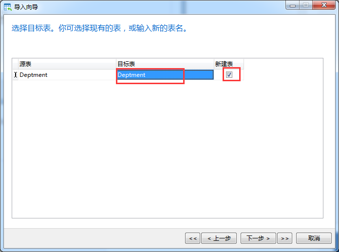 4)在目标表上输入 需要新建的表名,这里我输入的是deptment,点击下一步