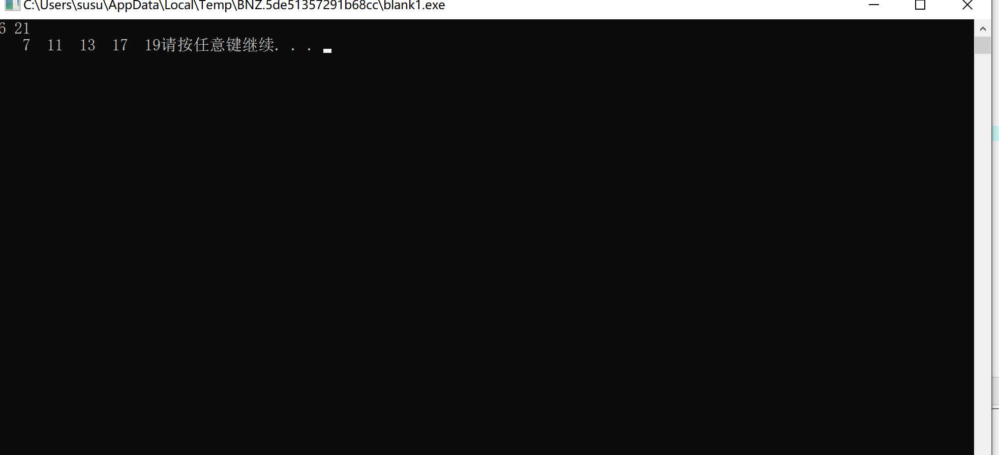 // 函数fun()的功能是: 找出能够被x整除并且是偶数的数, // 把这些数保存在数组bb中,并按从大到小的顺序输出。 // 例如,当x=20时,依次输出: 20 10 4 2。 #include <stdio.h> #include <stdlib.h> void fun(int k,int bb[]) { int i; int j=0; for(i=1; i<=k; i++) { if(k%i==0&&i%2==0) bb[j++]=i; } for(i=j-1; i>=0; i--) // blank3 printf("%d ",bb[i]); } int main() { int x, *t; scanf("%d", &x); // 向系统申请sizeof(int)*x个字节的内存空间 // 如果申请成功,将系统分配的内存的首地址赋值给t t = (int *) malloc(sizeof(int)*x); fun(x,t); system("pause"); return 0; }