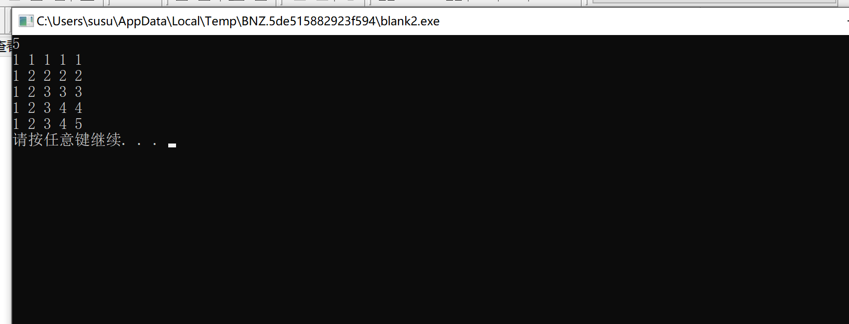 #include<stdio.h> #include<stdlib.h> #define N 100 void fun(int x[N][N],int n) { int i,j; for(i=1;i<=n;i++) for(j=1;j<=n;j++) if(i<j) x[i][j]=i; else x[i][j]=j; } int main() { int n,i,j,a[N][N]; scanf("%d",&n); fun(n,a); for(i=1;i<=n;i++) { for(j=1;j<=n;j++) printf("%d ",a[i][j]); printf("\n"); } system("pause"); return 0; }