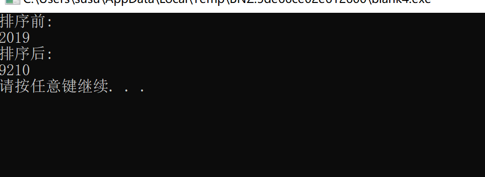 #include <stdio.h> #include <stdlib.h> const int N=4; void output(char x[], int n); // 函数声明 void fun(char a[N]); int main() { char string[N] = {'2','0','1','9'}; int i; printf("排序前: \n"); output(string, N); fun(string); printf("\n排序后: \n"); output(string, N); printf("\n"); system("pause"); return 0; } // 函数定义 // 函数功能描述:输出包含有n个元素的字符数组元素 // 形参:字符数组,以及字符数组元素个数 void output(char x[], int n) { int i; for(i=0; i<N; i++) printf("%c", x[i]); } void fun(char a[N]){ int i,j,t; for(j=0;j<N-1;j++) for(i=0;i<N-j-1;i++) if(a[i]<a[i+1]){ t=a[i]; a[i]=a[i+1]; a[i+1]=t; } }