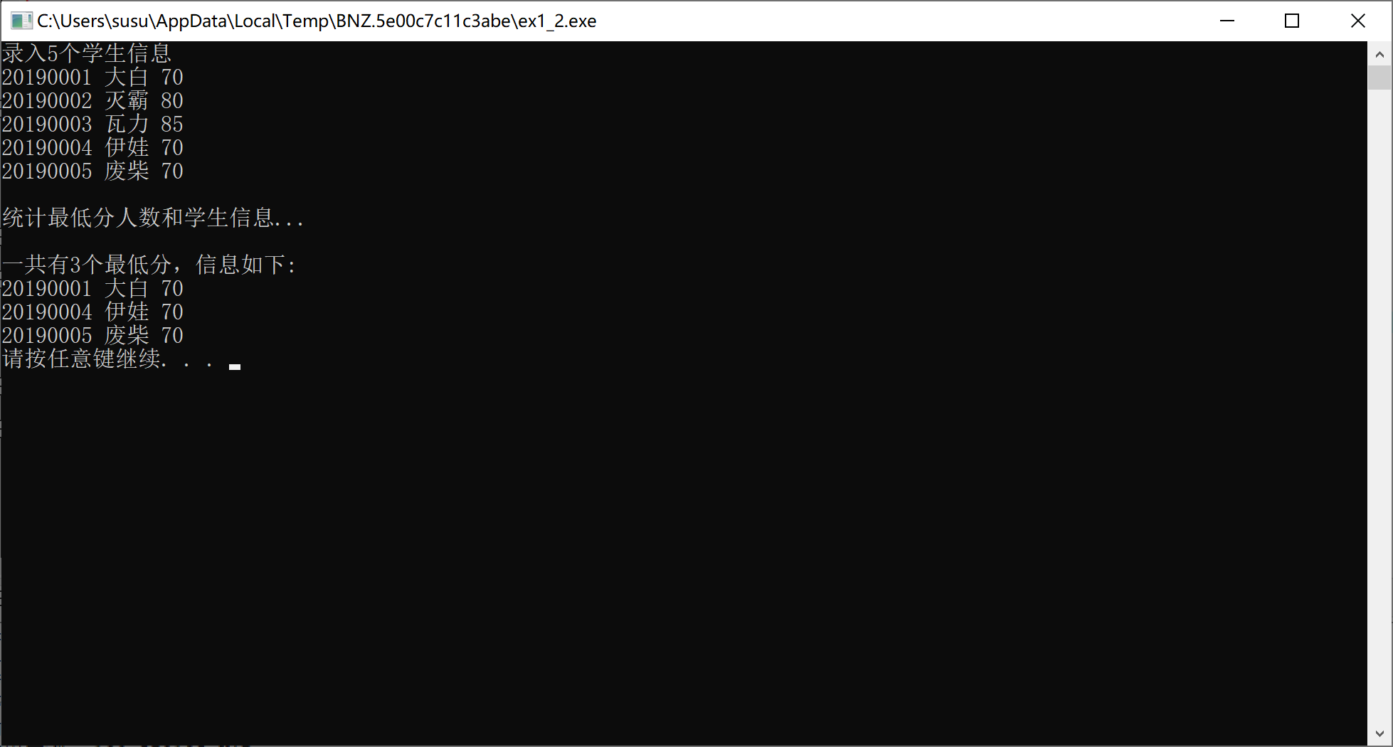 printf("\n一共有%d个最低分,信息如下:\n", count);