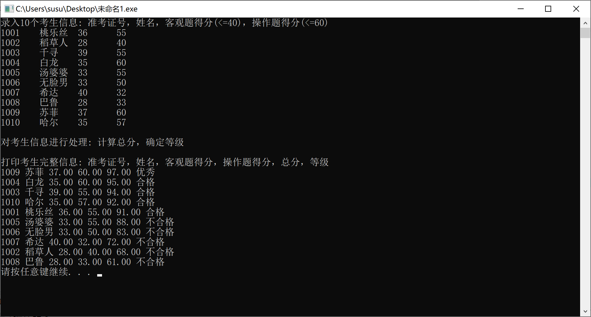 printf("\n打印考生完整信息: 准考证号,姓名,客观题得分,操作题得分,总分,等级\n");