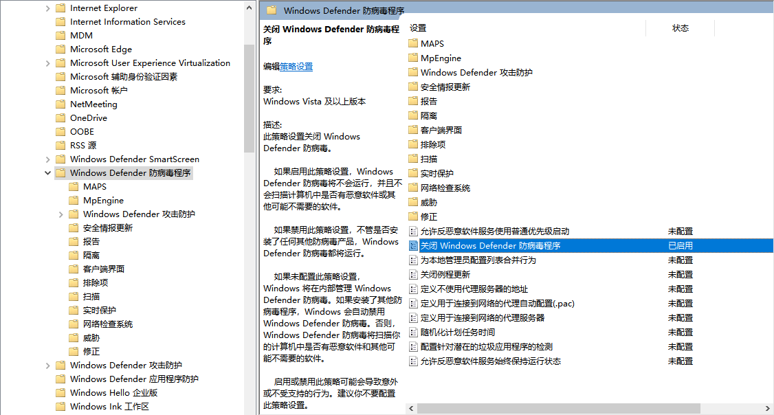 3。如果要关闭Windows defender,则将“关闭 Windows Defender”项设置为“已启用”即可。