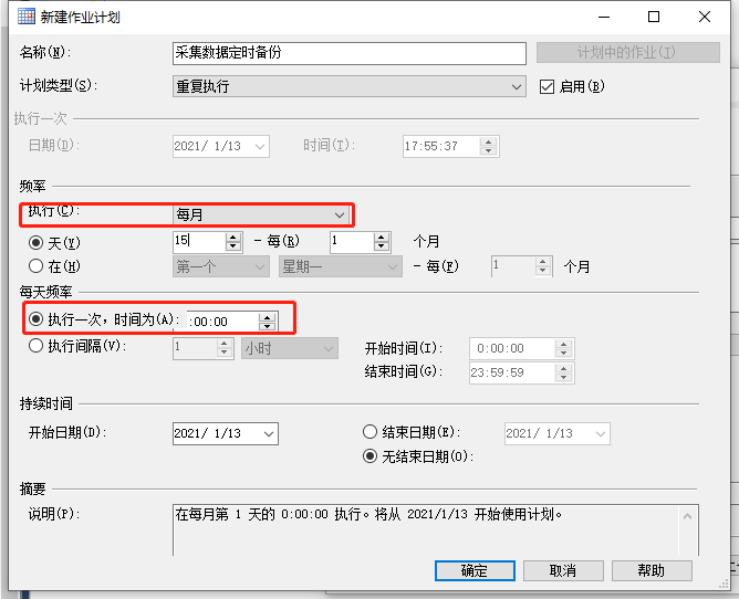 在出现的“作业计划属性”界面中,更改执行时间,也就是多久备份一次。这里该为每天备份。间隔时间更改为“1”更改执行一次时间为0:00:00也就是在每天的0点自动备份数据。