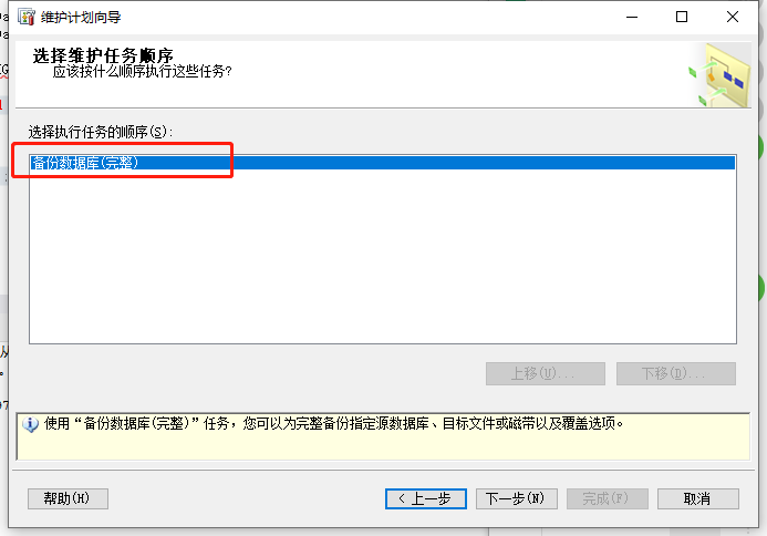 在选择维护任务顺序中,可以移动要备份的数据库文件的顺序。然后点击“下一步”