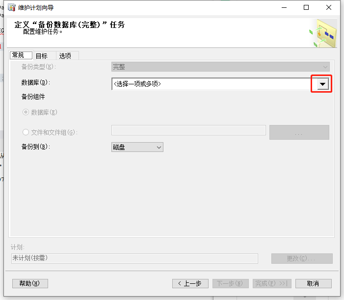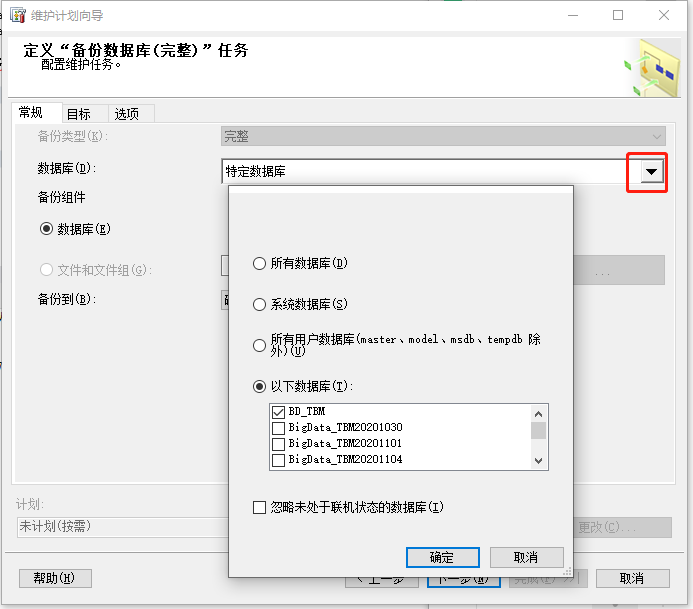 在定义“备份数据库完整”界面中,选择数据库后面下拉菜单中的数据库文件。然后点击“确定”按钮