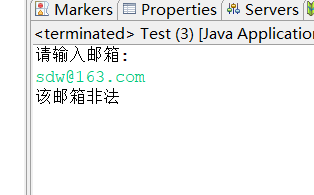 package gan; import java.util.*;; public class Test { public static void main(String[] args) { Scanner reader=new Scanner (System.in); System.out.println("请输入邮箱:"); String a=reader.nextLine(); String xx= "[a-zA-Z0-9_]+@[a-zA-Z0-9]+(\\.[a-zA-Z0-9-]+)+(com|cn)"; if(a.matches(xx)){ System.out.println("该邮箱合法"); }else{ System.out.println("该邮箱非法"); } } }
